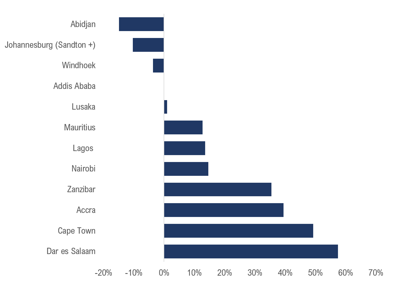 - Lagos (+14%) has grown consistently on the back of solid corporate demand and limited supply growth, resilient amid economic and political volatility.