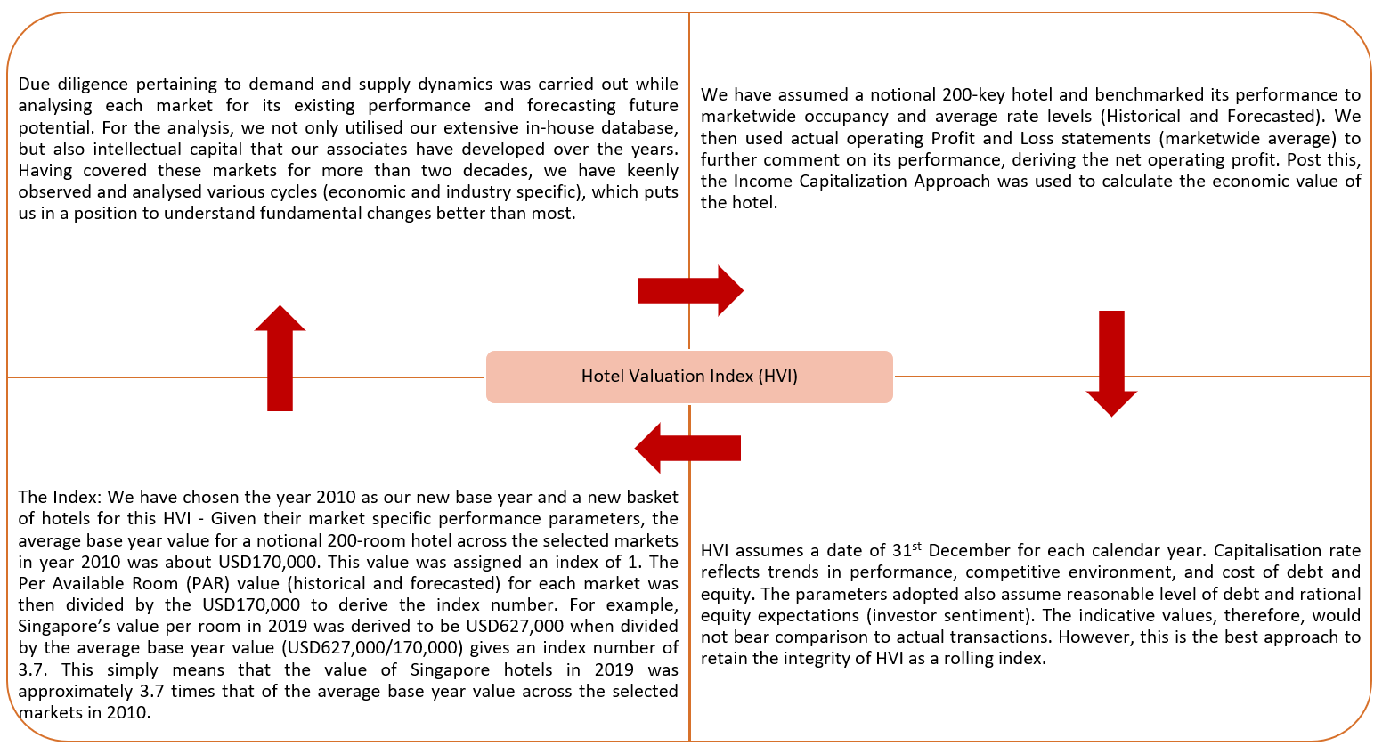 The HVI intends to create a platform where trends in hotel values are captured on an ongoing basis. We understand and appreciate the individual characteristics pertaining to each hotel asset. Therefore, it would be misrepresentative to look at a trend from the HVI and apply it to a specific asset. While this might give an indication of directional movement, for an investor or an owner, it is critical to capture hotel specific trends and factors to comment on its open market value.