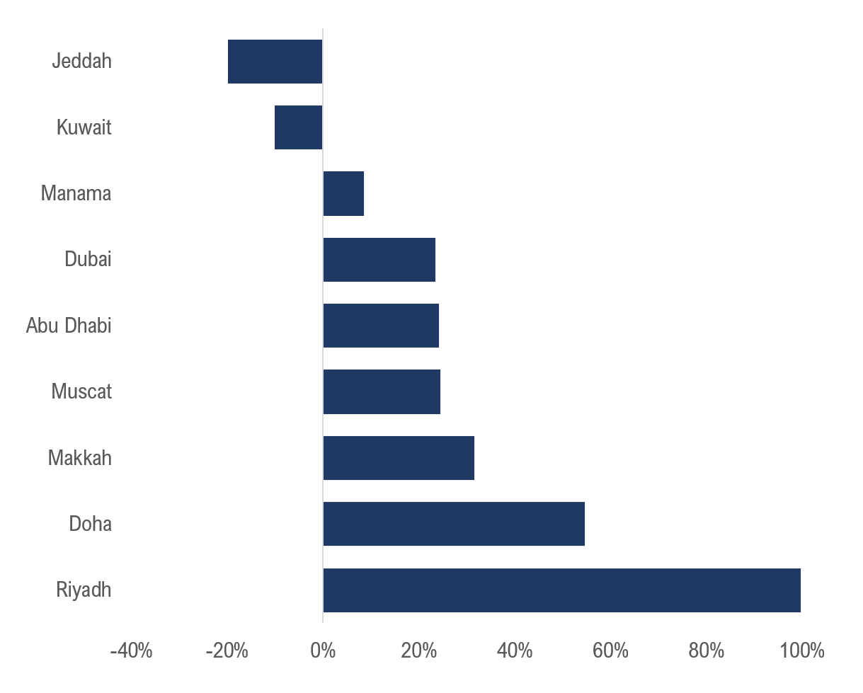 - Kuwait (-10%) and Jeddah (-20%) underperform relative to the regional average, highlighting structural constraints and shifting demand patterns.